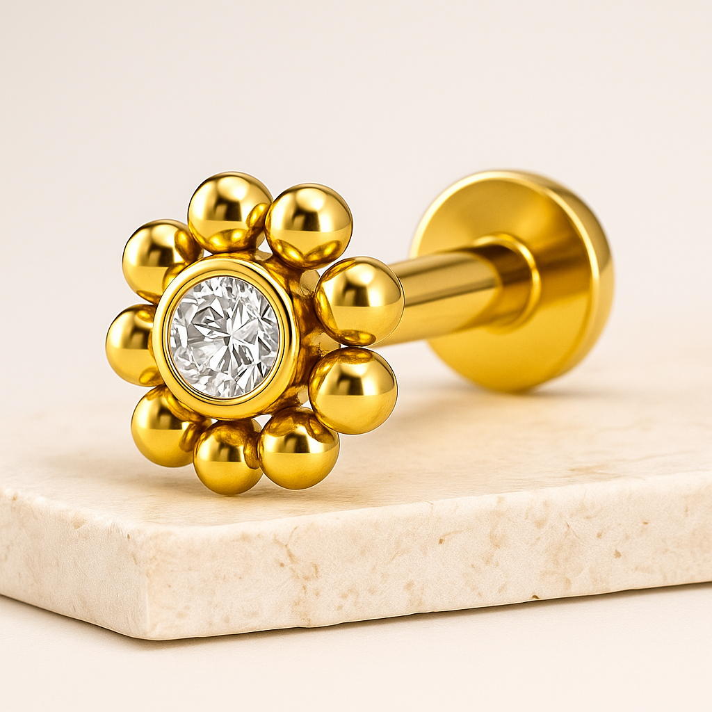 Bring elegance and shine to your piercings with Layali, a titanium flower cartilage stud earring inspired by the beauty of the night. Crafted from premium G23 Implant Grade Titanium, Layali features a sparkling central cubic zirconia stone surrounded by polished silver petals for a timeless floral look.