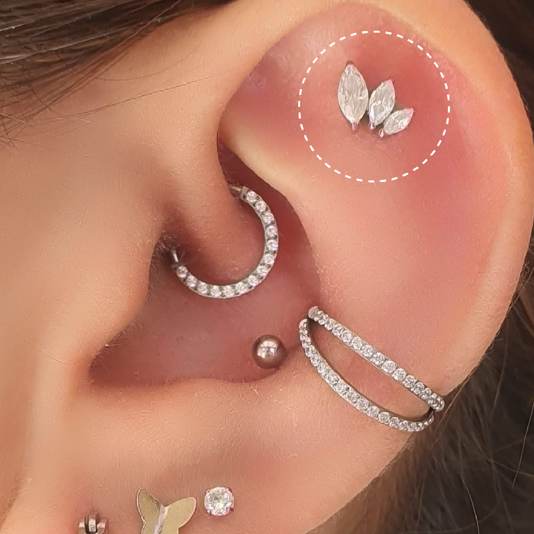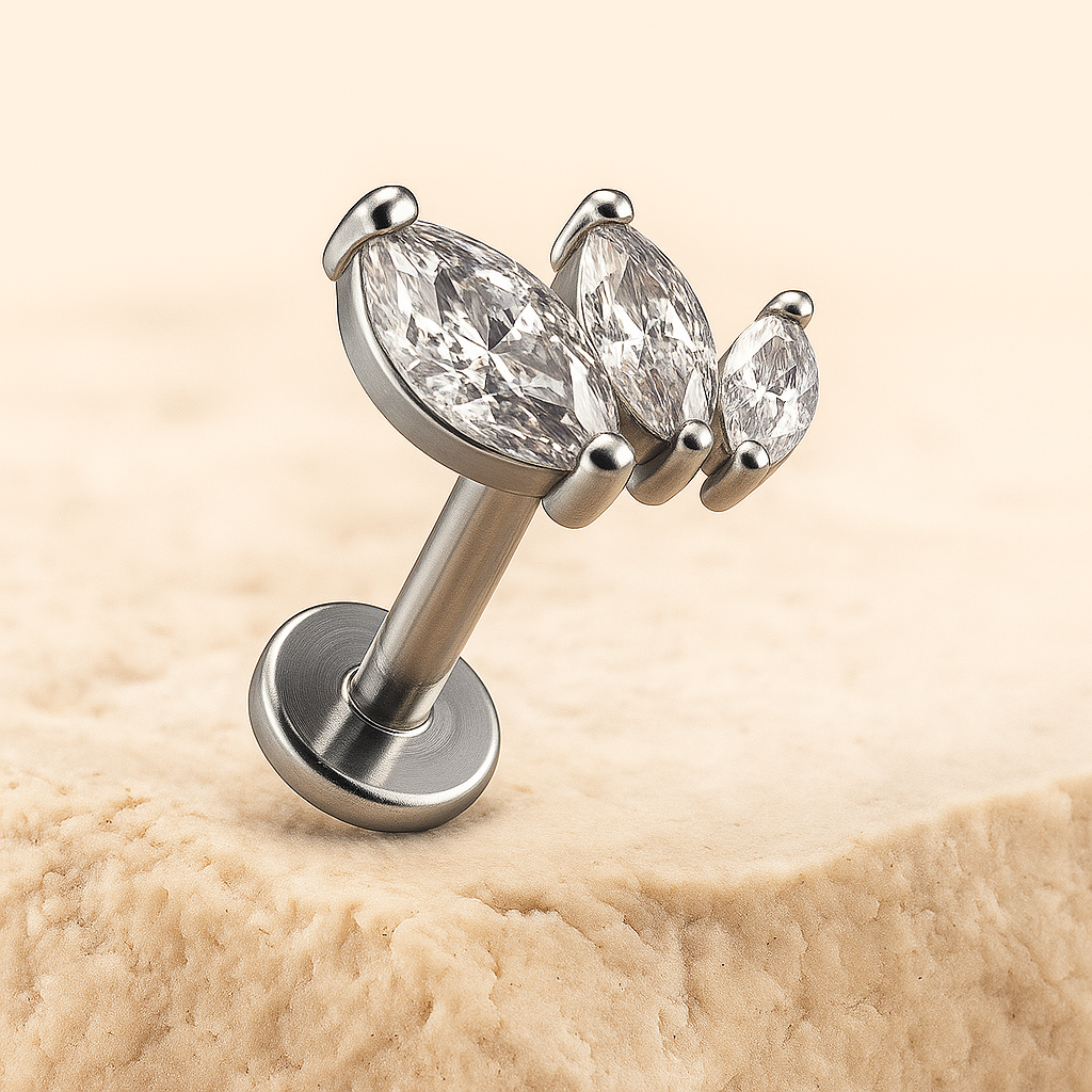 Elevate your style with the "Maya" Titanium Three Leaf Marquise Studāa fusion of nature's elegance and Cura's commitment to quality. Let your cartilage piercing shine with a piece that embodies both artistry and comfort.