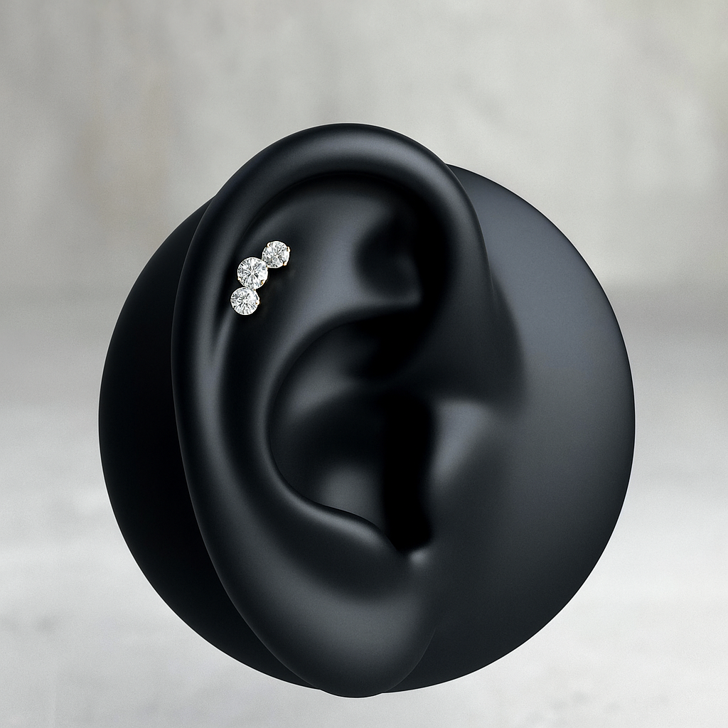 Enhance your style with the sophisticated brilliance of the "Sahar" 3 Stone Blaze Stud. Featuring a trio of gleaming crystals set in a sleek, minimalistic design, this stud adds a perfect touch of sparkle to any piercing. Available in silver and gold titanium finishes, it is crafted from implant-grade titanium to ensure safety and comfort for sensitive skin. Its labret flat-back design ensures a secure fit, making it ideal for long-term wear.