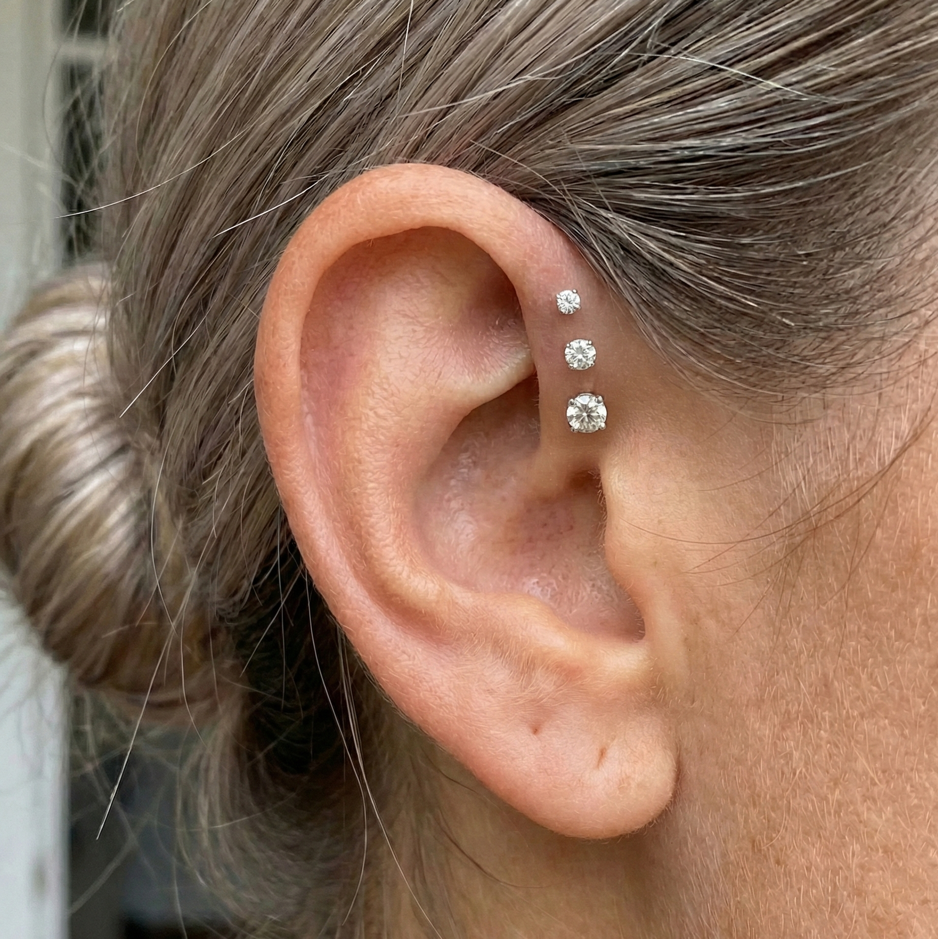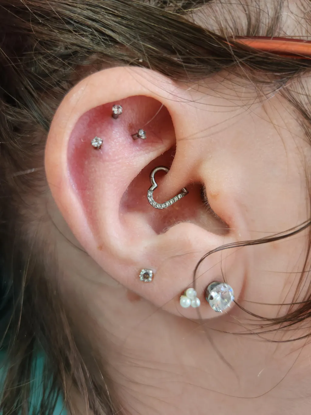 Pictured: Sofia threaded titanium studs in tragus and second lobe. Can't wait to replace my helix stud with one of these once it heals (man, I need to plan better). Also looking forward to bedazzling that conch once it heals (maybe with a 10mm Vera... or Isla... or Sana. So many options!).