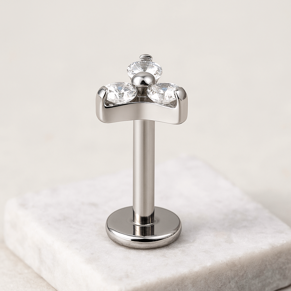 Step into a world of unmatched elegance with our Trinity Titanium Tristone Stud. Impeccably designed and expertly crafted, this exquisite labret is the epitome of sophistication for your cartilage piercings.