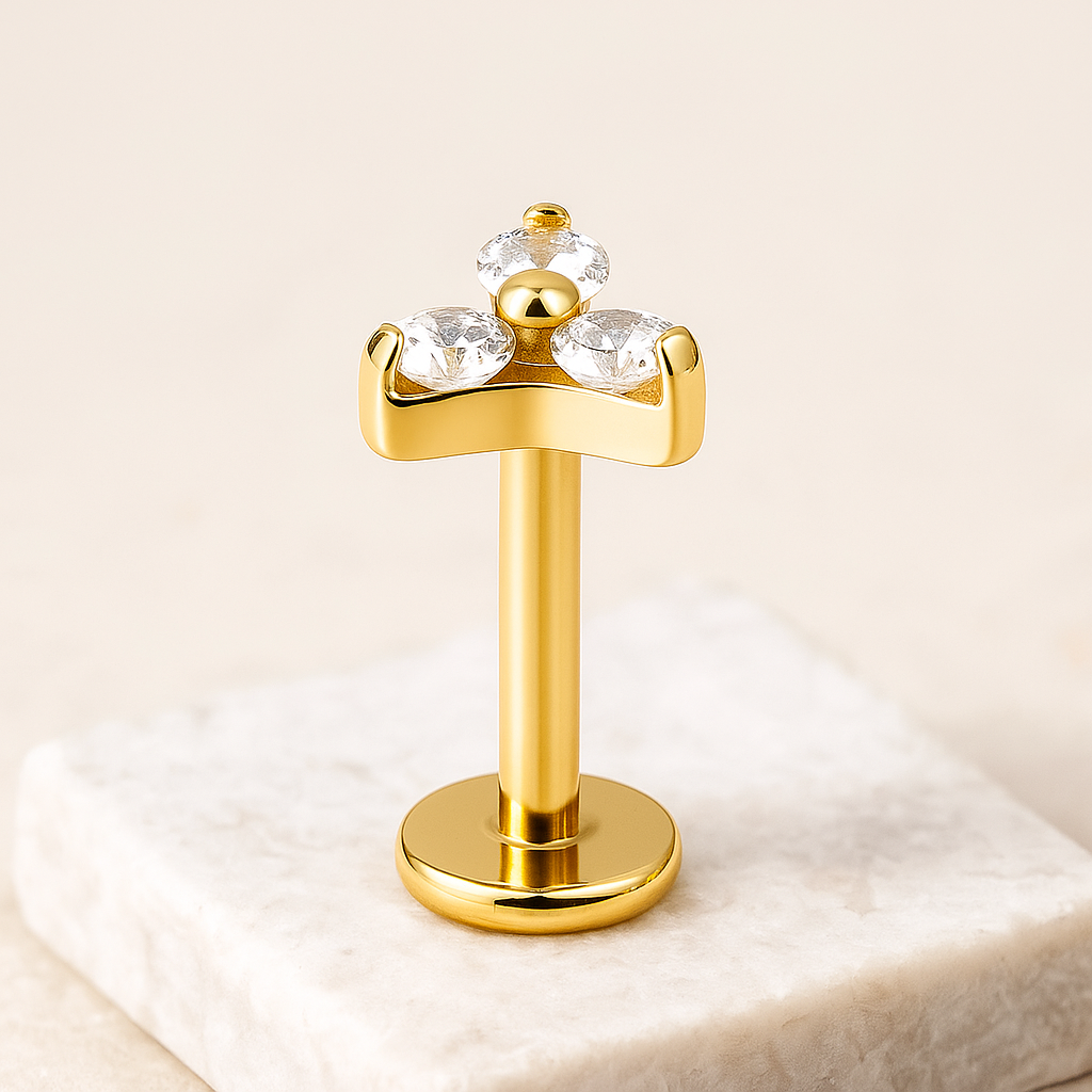 Step into a world of unmatched elegance with our Trinity Titanium Tristone Stud. Impeccably designed and expertly crafted, this exquisite labret is the epitome of sophistication for your cartilage piercings.